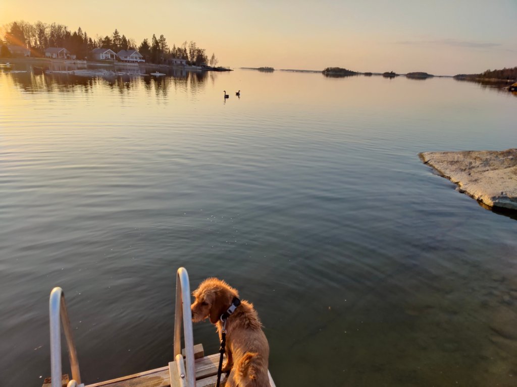 Igår blev jag storasyster och jag fick hela 6 systrar och två bröder. Samtidigt blev Smilla farmor efter Tuiskupolun Basse är pappa till mina syskon. Matte sa imorse att jag nu måste börja uppföra mig när jag blivit storasyster, men mina öron är lite smutsiga så jag hörde inte allt. I torsdags var jag med moffa på skönhetsträning eftersom matte har anmält mig till en skönhetstävling första helgen i juli. Jag vet nu inte vad jag ska säga om det, tycker ju mest om att springa efter harar, hjortar och rådjur! Jag är en skärgårdsbo. Dessutom älskar jag att simma. Jag simmar i alla diken jag hittar och även i havet! Det är så skönt!