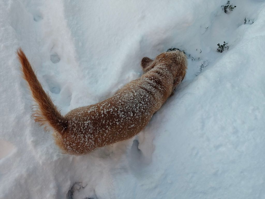 Idag (28.12.2020) var det dags för Tuiskupolun Bellas (FI18932/19, född den 7.2.2019) första drevprov. Förhållandena var utmanande eftersom marken frös på efter att det första söket startat. Det här gjorde att det första söket tog hela 238 minuter. Bella var dock envis och tog stora sökrundor tills hon fick upp klövdjuret. Under den första drevperioden samlade Bella 81 minuter skalltid. Mörkret hann lägga sig innan det var dags att den andra sökperioden – vilken blev endast två minuter lång och därför hann hon inte få upp något fler drev för dagen. Men resultatet är dock mycket bra i utmanande förhållanden för en knappt 2 – årig hund, som är på drevprov för första gången. Det här är en bra grund för fortsättningen! Drevprovet gjordes som del av Västkustens dreverklubbs säsongprov.
