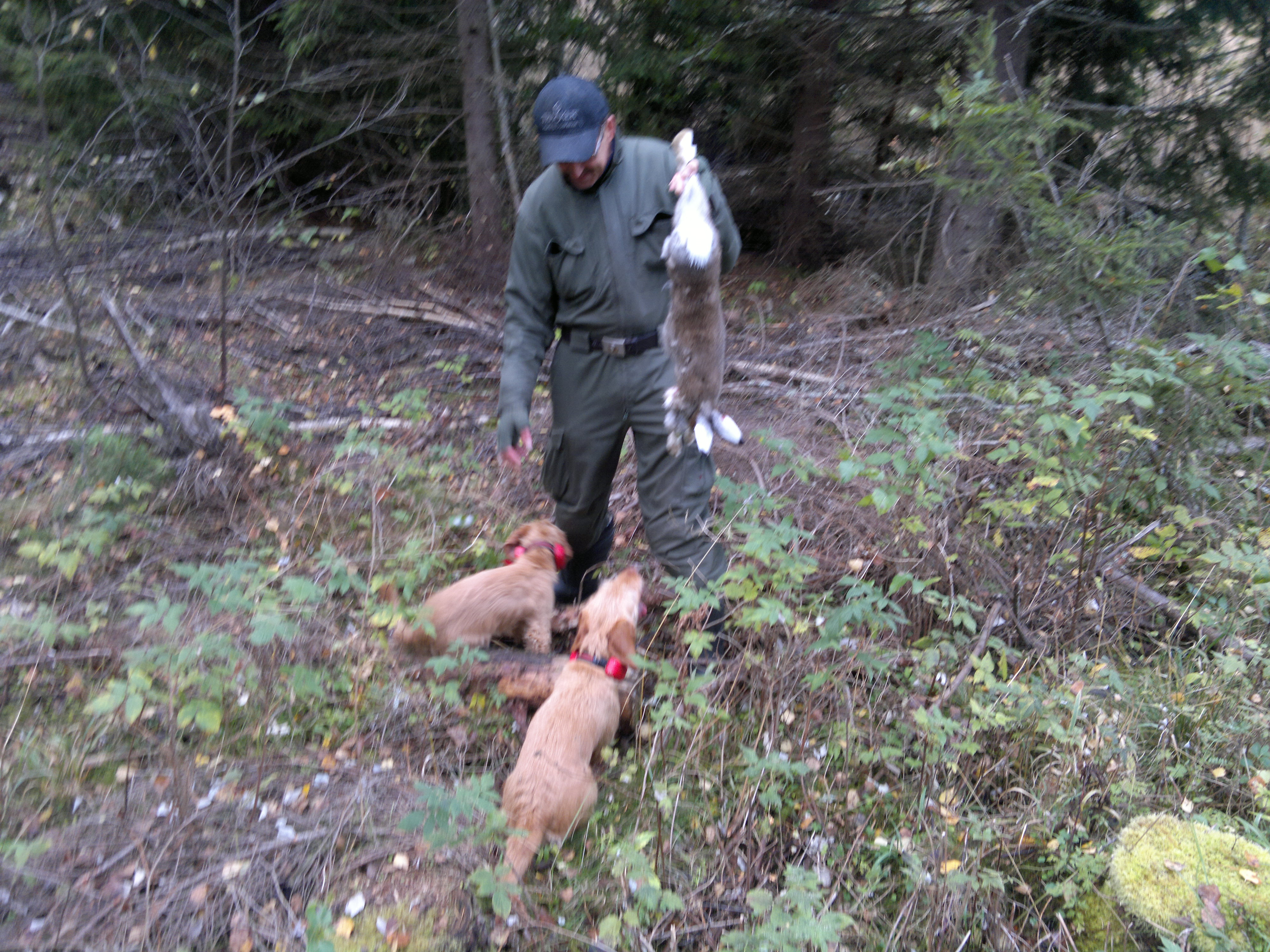 ”Erinomaiset haut, ylösotto hyvä, sujuva ajo, yksiääninen, ei kertova, harvahkko haukku Mi 3/3. Tottelevainen koira. VOI 1 64,27 pistettä mäkistö sekametsää, tuuliset olosuhteet.